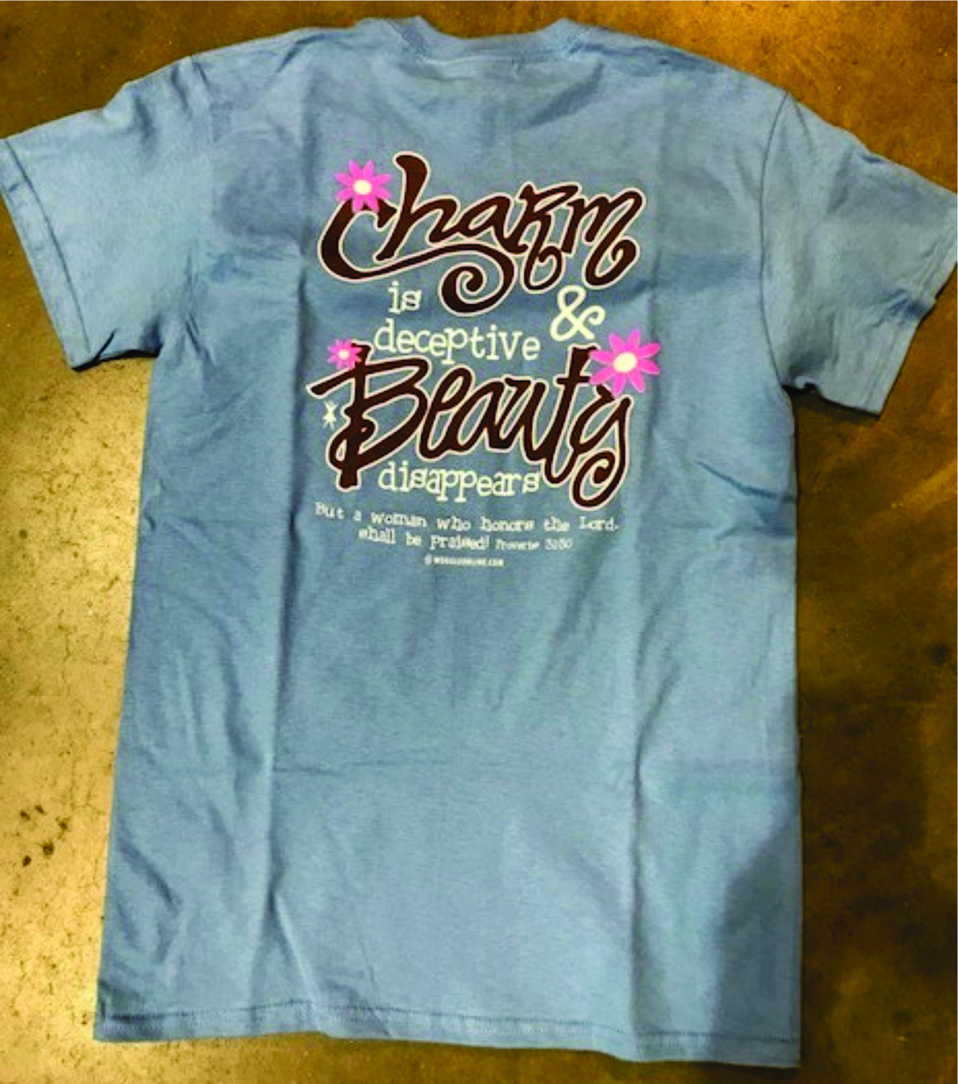 Short Sleeve Orange or Carolina Blue Tee with New Proverbs 31 graphic on full back and Woggle logo on left chest in whi, brown te and Hot pink. Proverbs 31:30